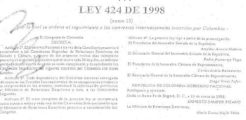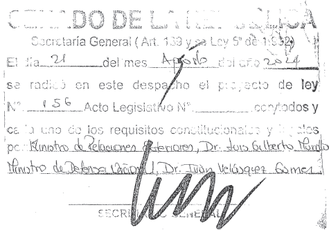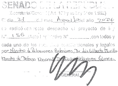 Presentado al Honorable Congreso de la República por el Ministro de Relaciones Exteriores y el Ministro de Defensa Nacional.