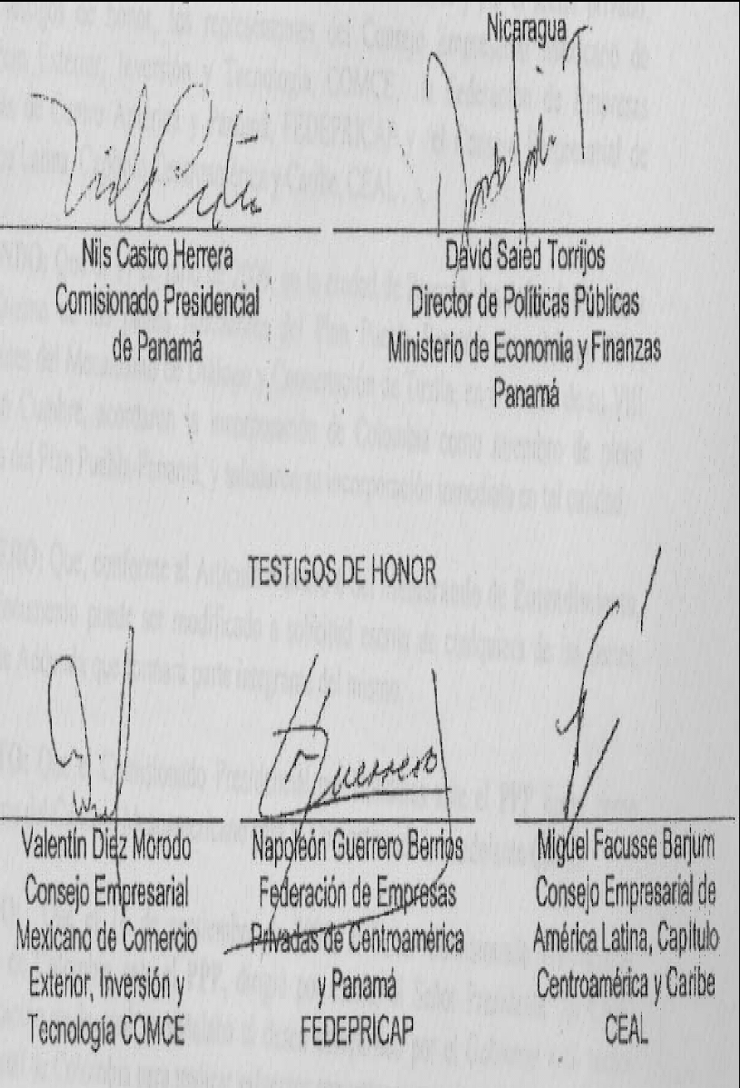 En concordancia con el espíritu de colaboración entre el sector empresarial y los representantes gubernamentales del Consejo, los representantes empresariales por México y Centroamérica formalizan su alianza con el Consejo, firmando como testigos del presente Memorando, convencidos de la necesidad de asumir corresponsablemente los retos para generar mejores niveles de competitividad y consecuentemente un mayor crecimiento económico de la región.