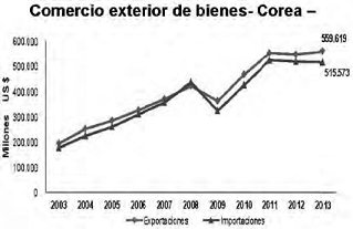 La República de Corea –en adelante Corea– es un país que ha logrado destacarse en la economía mundial: entre 2000-2007 el PIB registró una tasa media de crecimiento de 5,2%, por encima del promedio mundial (3,2%). Dada la fortaleza de su estructura productiva, reaccionó rápidamente para salir de la crisis: en 2010 el PIB creció 6,3% y en 2011 lo hizo en 3,7%, mientras que el promedio mundial fue de 4 y 2,8%, respectivamente. En 2013, su crecimiento alcanzó el 2,8% y las estimaciones del FMI indican que Corea cerrará en 2014 con una variación positiva del PIB de 3,7%.